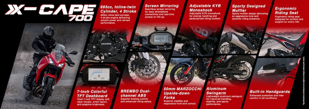 Bagi pembeli yang mahukan sebuah motosikal kembara serba lengkap terus dari kilang, Moto Morini X-CAPE 700 2026 hadir dengan ciri moden seperti panel meter TFT 7 inci, Sistem Kawalan Traksi (TCS), Sistem Pemantau Tekanan Tayar (TPMS), kamera depan, sambungan Bluetooth, dan set kotak touring standard.