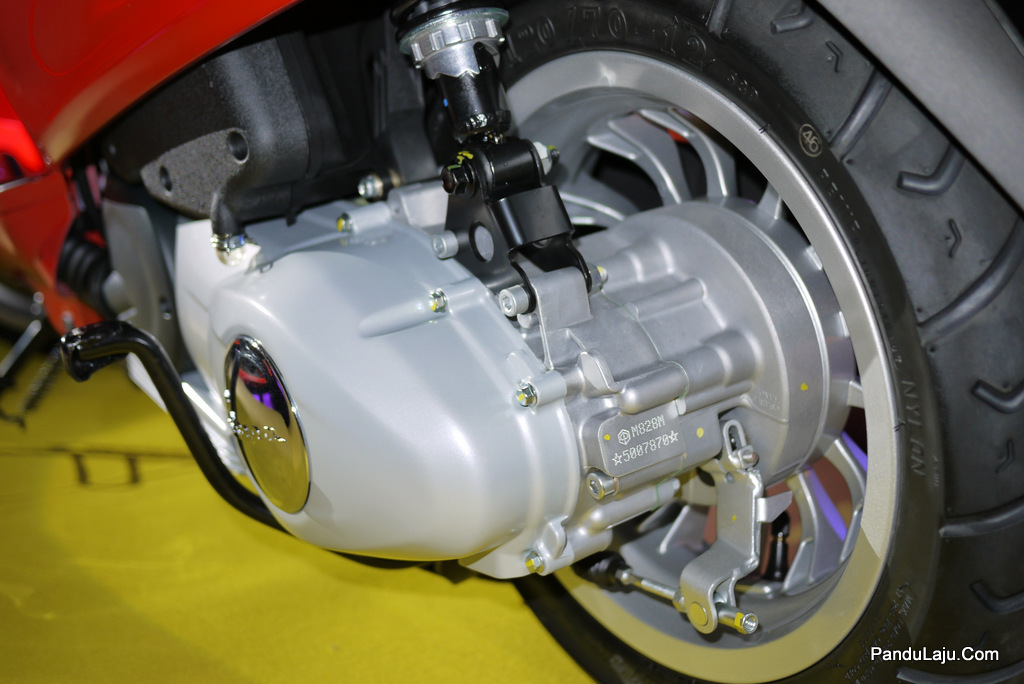 TAYAR 110/70 R12 tubeless (hadapan); 120/70 R18 tubeless (belakang)