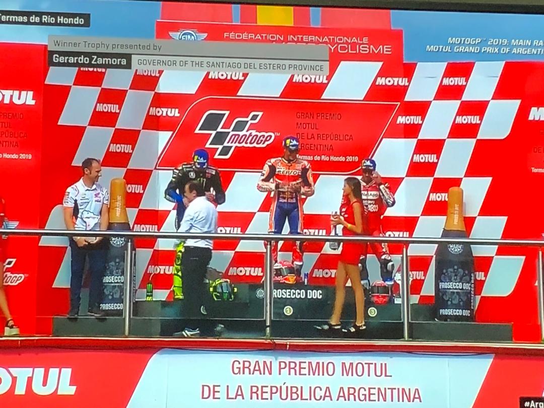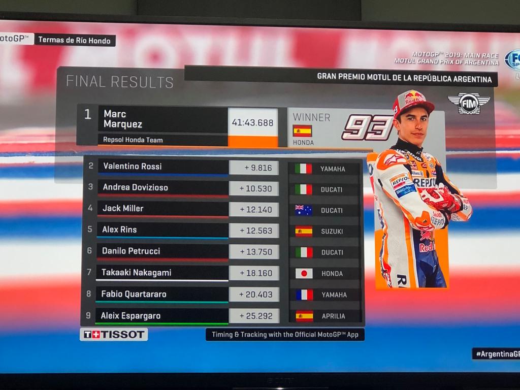 Marquez yang bermula di petak pertama langsung tidak menoleh ke belakang dengan menjarakkan diri sejauh-jauhnya dari pesaing di belakang, sekali gus menebus kekecewaan yang dialaminya di litar sama, setahun lalu. Jadi, saingan di Argentina lebih bertumpu kepada perebutan tempat kedua dan ketiga antara Rossi dan Dovizioso dalam usaha mengekalkan posisi terbaik selain cuba memanjangkan jangka hayat tayar.