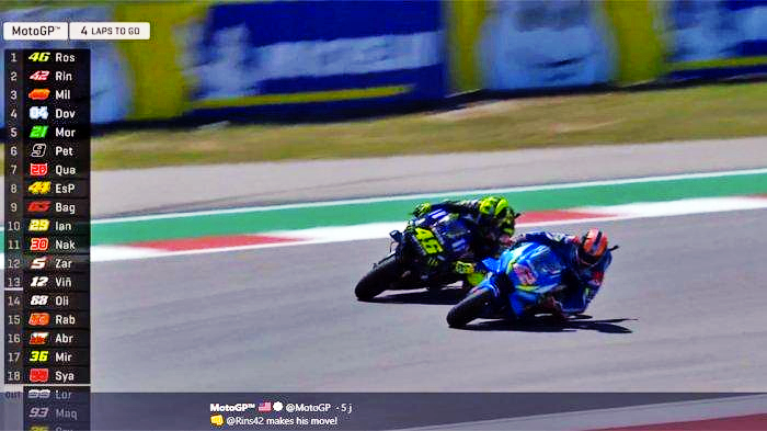 Insiden menimpa Marquez membuka peluang kepada kekanda disayangi, Valentino Rossi mengambil alih teraju pelumba paling depan sebelum dipintas Rins ketika perlumbaan berbaki tiga pusingan.