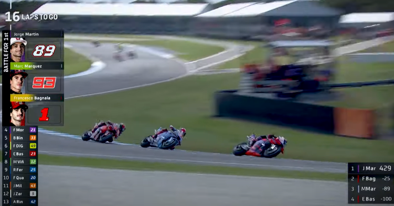 Perlumbaan kemudian menjadi semakin sengit pada pusingan ke-12 apabila Marquez bersaing bersama dua calon juara musim ini, iaitu pelumba sensasi, Francesco Bagnaia dan pendahulu ranking setakat ini, Jorge Martin.