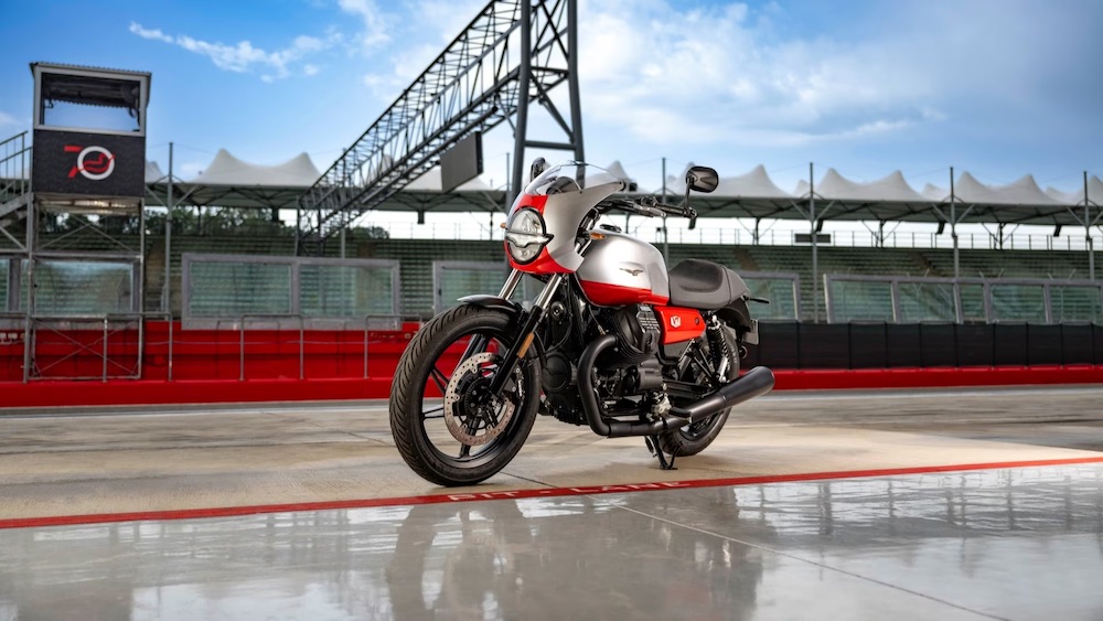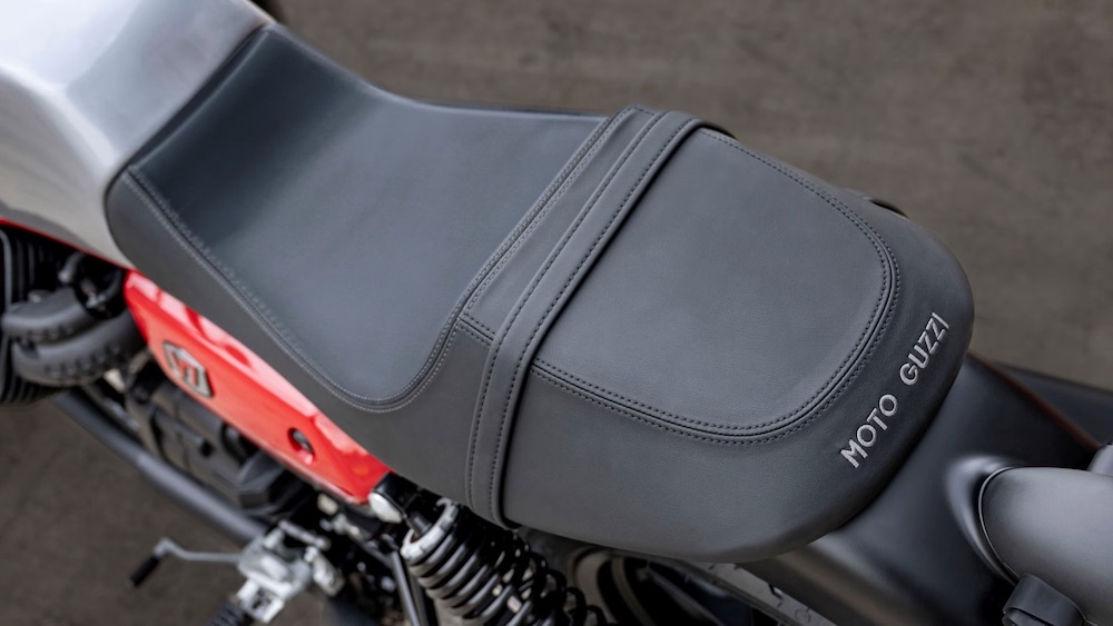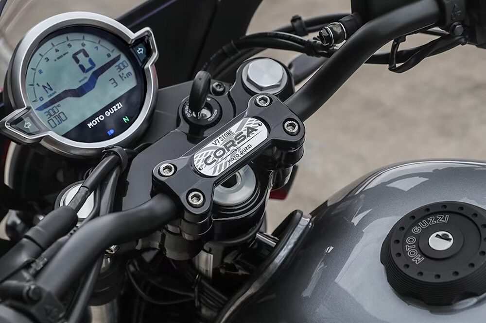 MotoGuzzi V7 Stone Corsa (2023) memiliki banyak kaitan dengan V7 Stone walaupun ada perbezaan tersendiri dengan skema dwi-tona perak dan merah serta beberapa perincian lain.