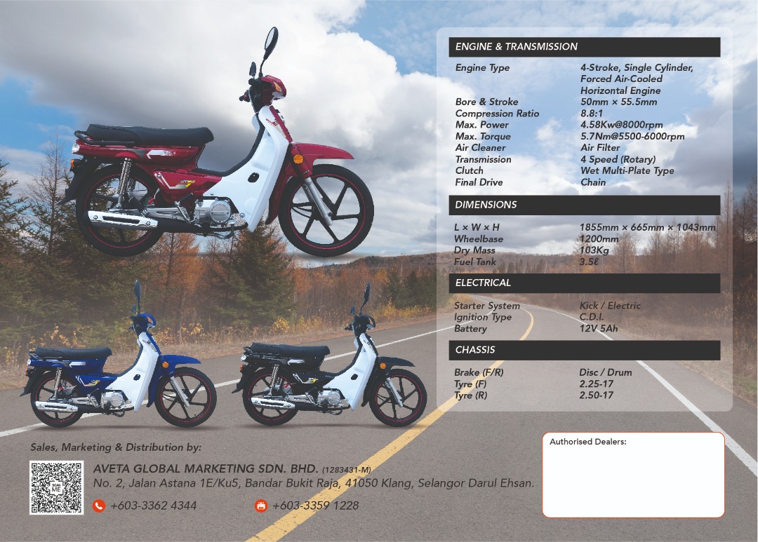 Jenama buatan tempatan ini mula menembusi pasaran negara pada tahun lalu. Buat masa ini, produk utama dipasarkan Aveta ialah DY90 dan RX110 dalam usaha menambat hati peminat kapcai Malaysia.