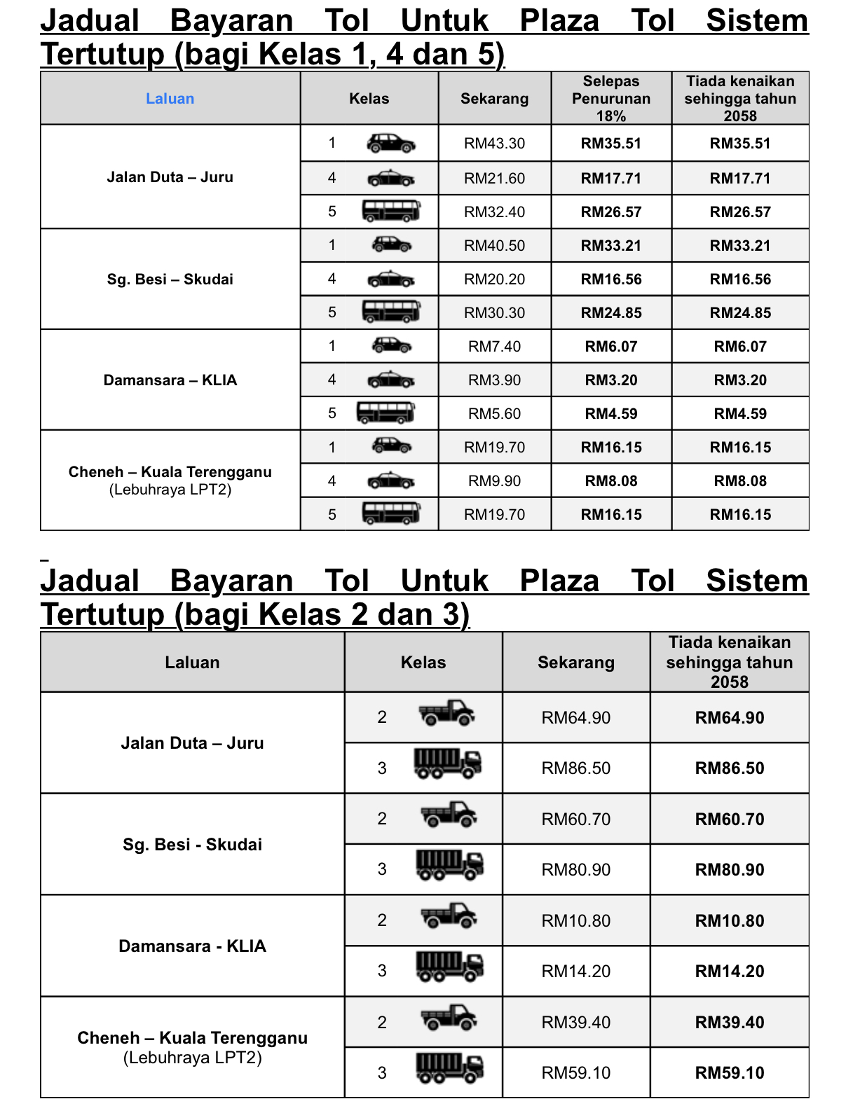 Penurunan kadar tol ini juga akan dilaksanakan untuk Kenderaan Penumpang dan Teksi (Kelas 2) serta Bas (Kelas 3, 4 dan 5) di Plaza Tol Jambatan Pulau Pinang. Bagi kenderaan Kelas 2 dan mereka yang bekerja di Pulau Pinang yang berdaftar dengan PLUS pula akan menikmati penurunan 18 peratus tersebut sebagai tambahan kepada diskaun 20 peratus sedia ada.