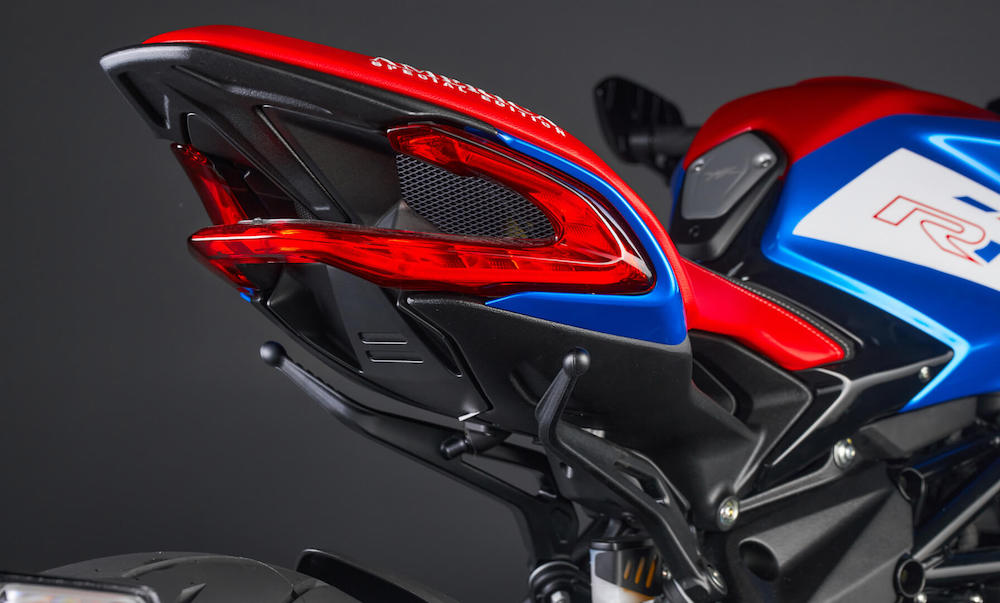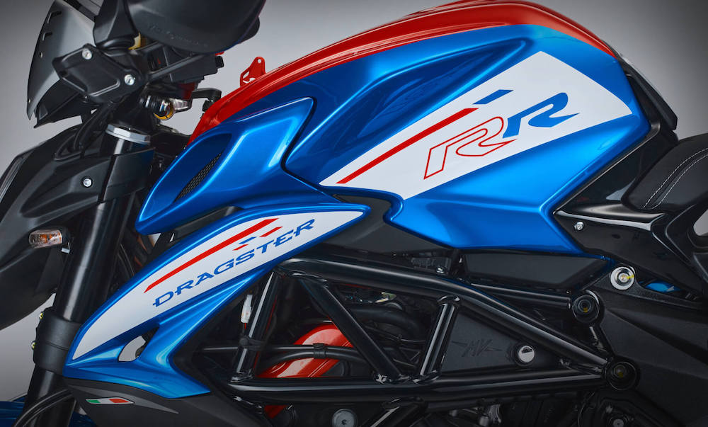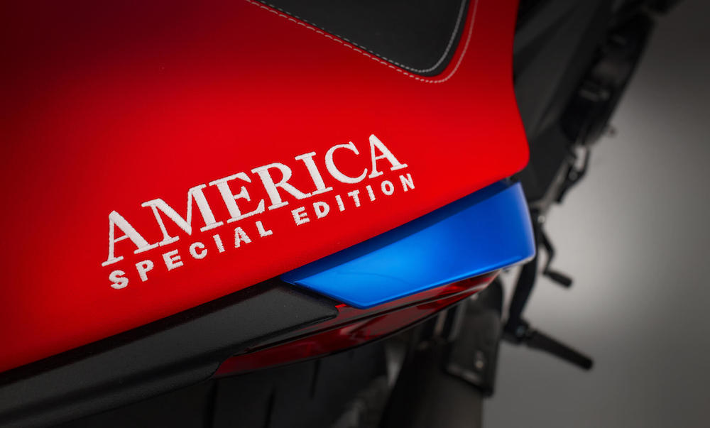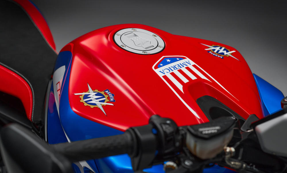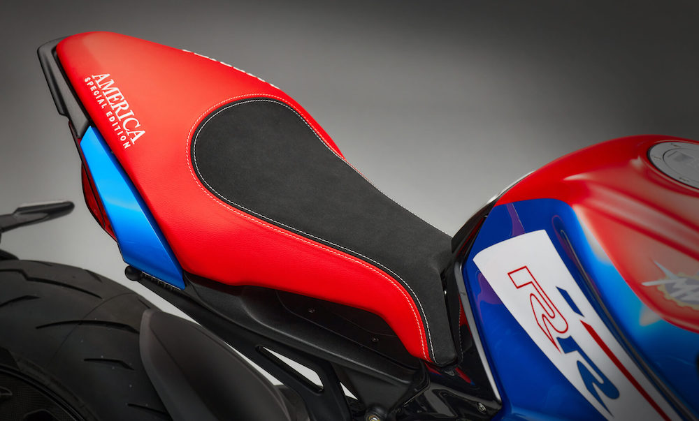 MV Agusta Dragster SCS America (2024) sekali lagi menggunakan skema warna merah, putih dan biru dengan pelana menerima jahitan tangan teks ‘America Special Edition’.