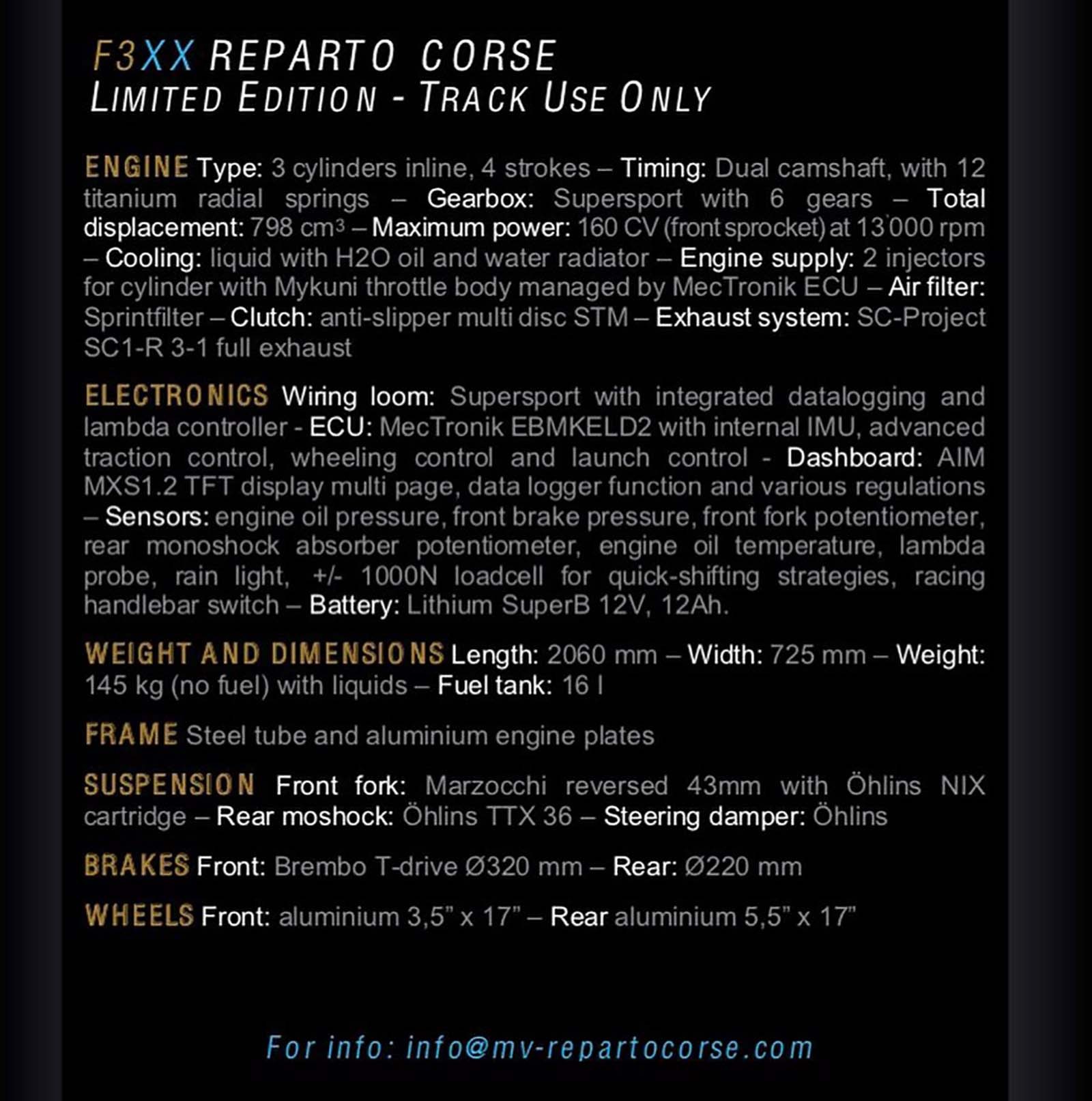 MV Agusta melancarkan superbike spesifikasi trek edisi terhad, dinamakan F3XX yang dibina berasaskan F3 800 standard. Model ini dibangunkan divisyen perlumbaan MV Agusta, Reparto Corsa yang nampaknya cuba mengurangkan berat jentera ini sebanyak mungkin dan pada masa sama berusaha memaksimumkan potensi kuasa dimiliki.