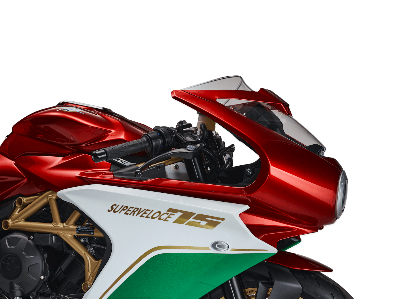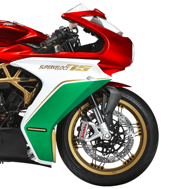 Superveloce 75 Anniversario ini menampilkan seragam khas dalam kemasan triwarna bendera Itali pada fairing, rim emas, pelana Alcantara merah, plat aluminium bernombor pada kepala stereng dan komponen titanium untuk injap ekzos dan ambilan. Aspek prestasi, pemilik akan mendapat unit enjin yang ditala semula, dan ekzos Arrow yang hanya boleh digunakan untuk tunggangan dalam trek.