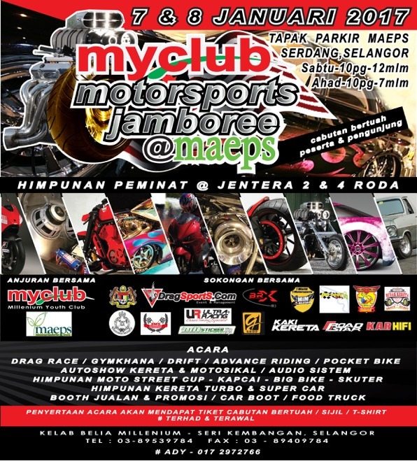 DALAM usaha membangunkan lagi sukan permotoran di Malaysia, Kelab Belia Millenium (MYCLUB) bakal menggegarkan dunia permotoran menerusi penganjuran MYCLUB Motorsports Jamboree pada 7 dan 8 Januari 2017 di ruang parkir Taman Ekspo Pertanian Malaysia Serdang (MAEPS), Serdang, Selangor.