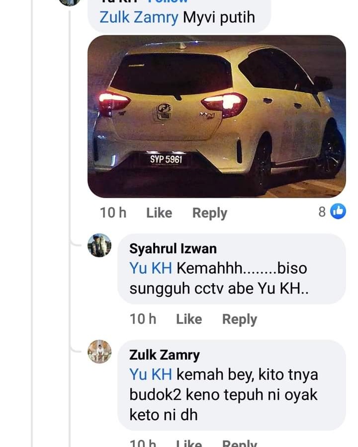 Sumber polis pula memaklumkan sudah menerima laporan berhubung insiden langgar lari berkenaan dan akan memanggil pemilik Myvi itu untuk diambil keterangan. Bagaimanapun polis tidak dapat memastikan sama ada kenderaan itu dicuri atau digunakan ahli keluarga.