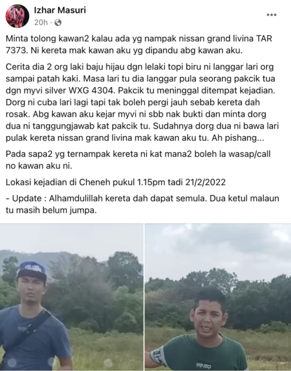 Pemuda itu kemudian hadir ke Ibu Pejabat Polis Daerah Kemaman membuat laporan polis. Kedua-dua suspek kini sedang diburu dan kes disiasat di bawah Seksyen 41 (1) Akta Pengangkutan Jalan APJ 1987. Dalam perkembangan terbaharu, kereta Grand Livina itu ditemui ditinggalkan dekat Kolej Universiti Widad di Kuantan, Pahang.