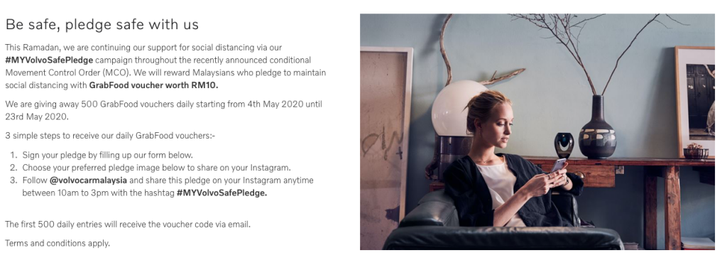 VOLVO Car Malaysia (VCM) akan memberikan baucar GrabFood bernilai RM10 kepada rakyat Malaysia yang patuh penjarakan sosial di bawah Perintah Kawalan Pergerakan Bersyarat (PKPB).