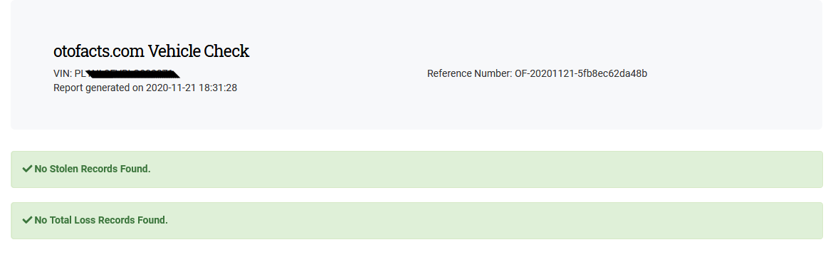Di bawah ini adalah huraian dan contoh sampel mengenai laporan sejarah kenderaan yang anda akan terima jika menggunakan perkhidmatan OTOFACTS, berbeza mengikut negara diimport. Antara maklumat asas diberikan ialah ringkasan pantas kereta, dan sejarah kereta seperti status kemalangan dan baik pulih, jarak perbatuan, jumlah pemilik dan makluman notis panggil balik (jika ada).