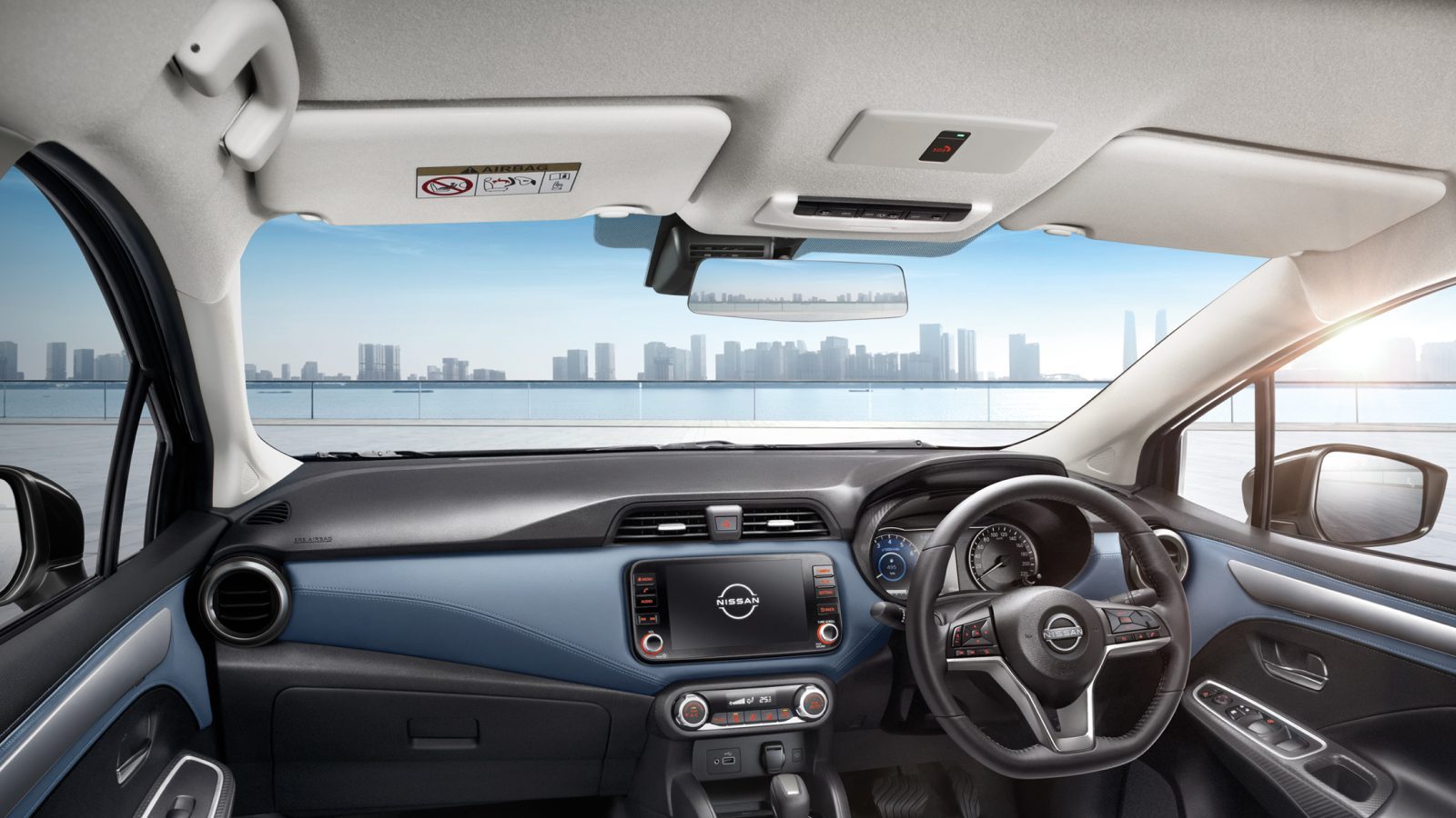 Ruang dalaman Nissan Almera (2023) facelift di Thailand menerima warna kabin baharu dalam skema hitam dan biru (mengikut varian) berbanding hitam putih dan sebelum ini.