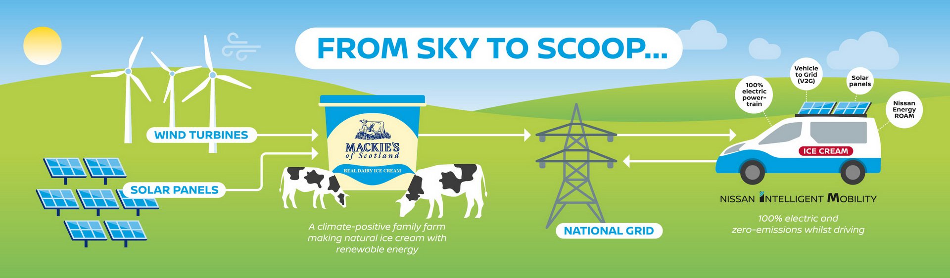 Semua kelengkapan membuat aiskrim, termasuk kotak ais, peti sejuk minuman, dan mesin aiskrim dikuasakan Nissan Energy Roam. Pek bateri mudah alih yang akan dijual tahun ini, terdiri daripada sel litium-ion dengan sumber daripada EV Nissan generasi pertama.