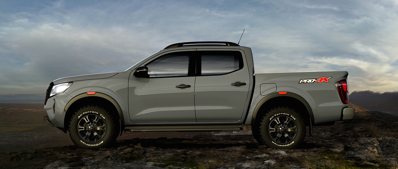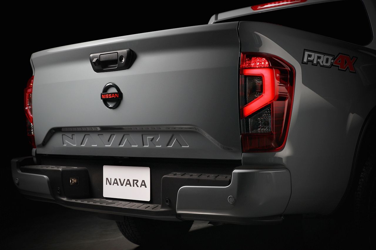 Dari tepi, Navara Pro-4X seperti dipaparkan ini mempunyai lapik fender lebih lebar, rim aloi hitam 17 inci dengan tayar AT (all-terrain) yang sesuai untuk semua jenis rupa bumi. Bahagian belakang direka menyamai bahagian depan dengan rupa lasak. Bahagian bawah pintu but mempunyai ruang atau lekukan ke dalam yang tertera logo Navara.