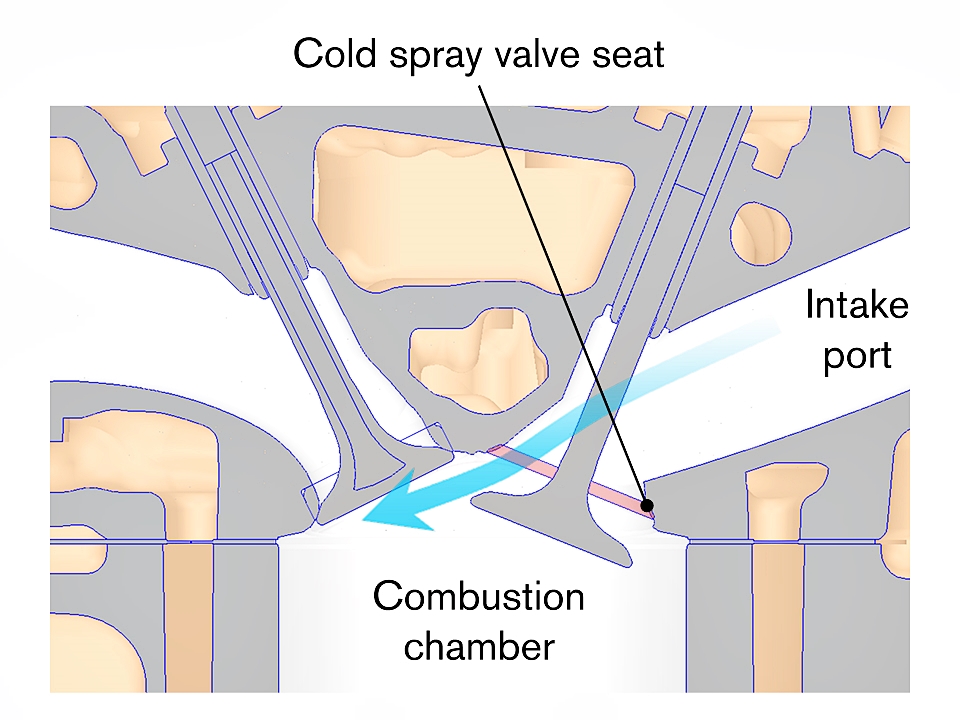 - Proses Semburan Sejuk: Proses ini membolehkan salutan dibentuk secara langsung pada permukaan kepala silinder, menghapuskan keperluan untuk komponen dudukan injap yang berasingan dan membolehkan reka bentuk geometri saluran masuk yang optimum. Selain itu, ia juga meningkatkan prestasi penyejukan di sekeliling injap berbanding kaedah lain.