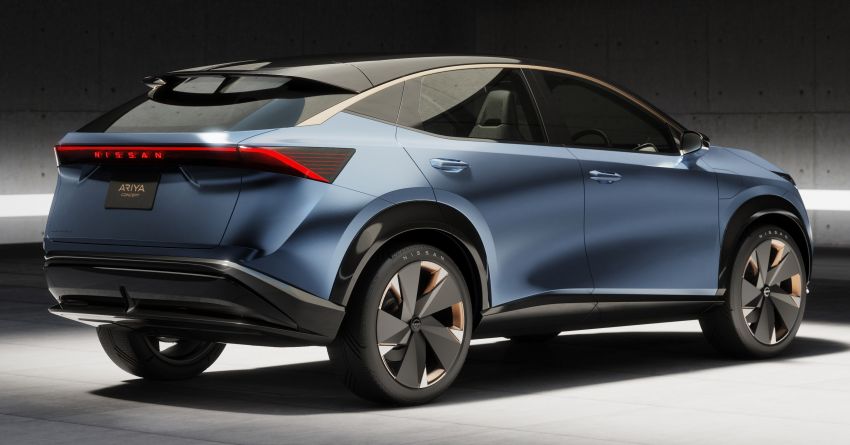 Bahagian belakang turut kelihatan strip pencahayaan antara lampu belakang tanpa efek tiga dimensi (3D), sama seperti model konsep. Turut kelihatan lencana e-4ORCE buat kali pertama yang membawa maksud trenkuasa dwi motor digunaka Ariya.
