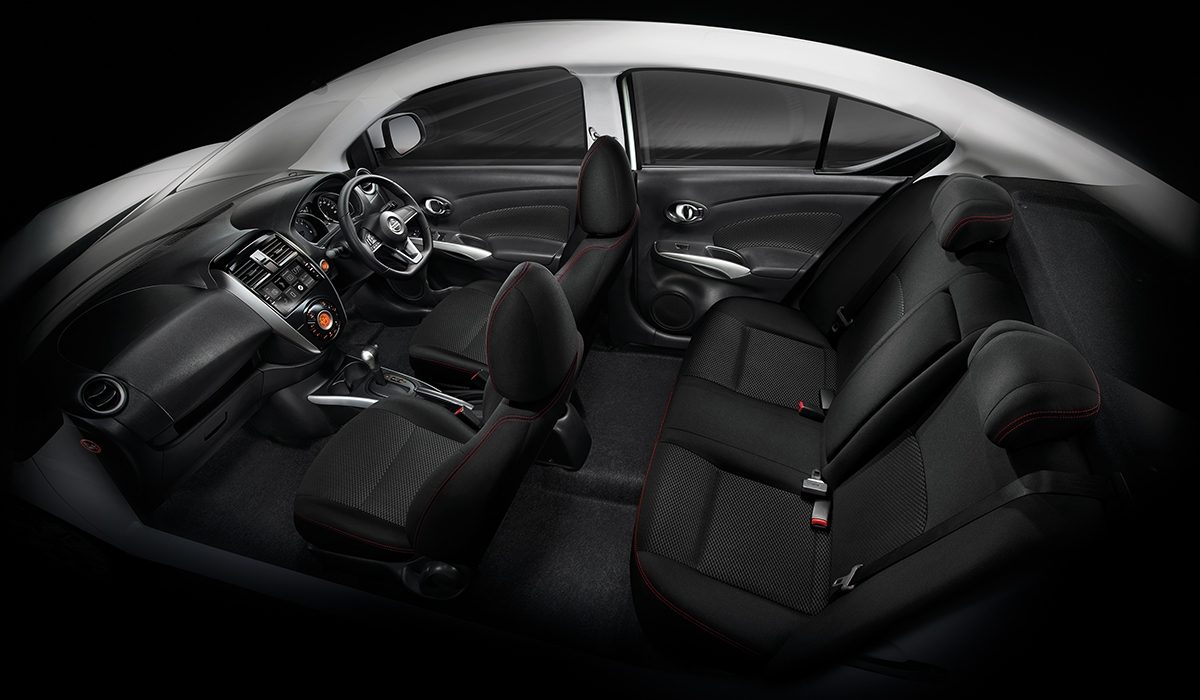 Ruang kabin Almera baharu ini juga berbeza. Rekaan stereng kini dalam bentuk 3 jejari dengan bahagian bawah flat seperti kereta lumba lagaknya. Skrin sentuh tidak dibesarkan, manakala panel pintu mendapat kemasan dan pad baharu.