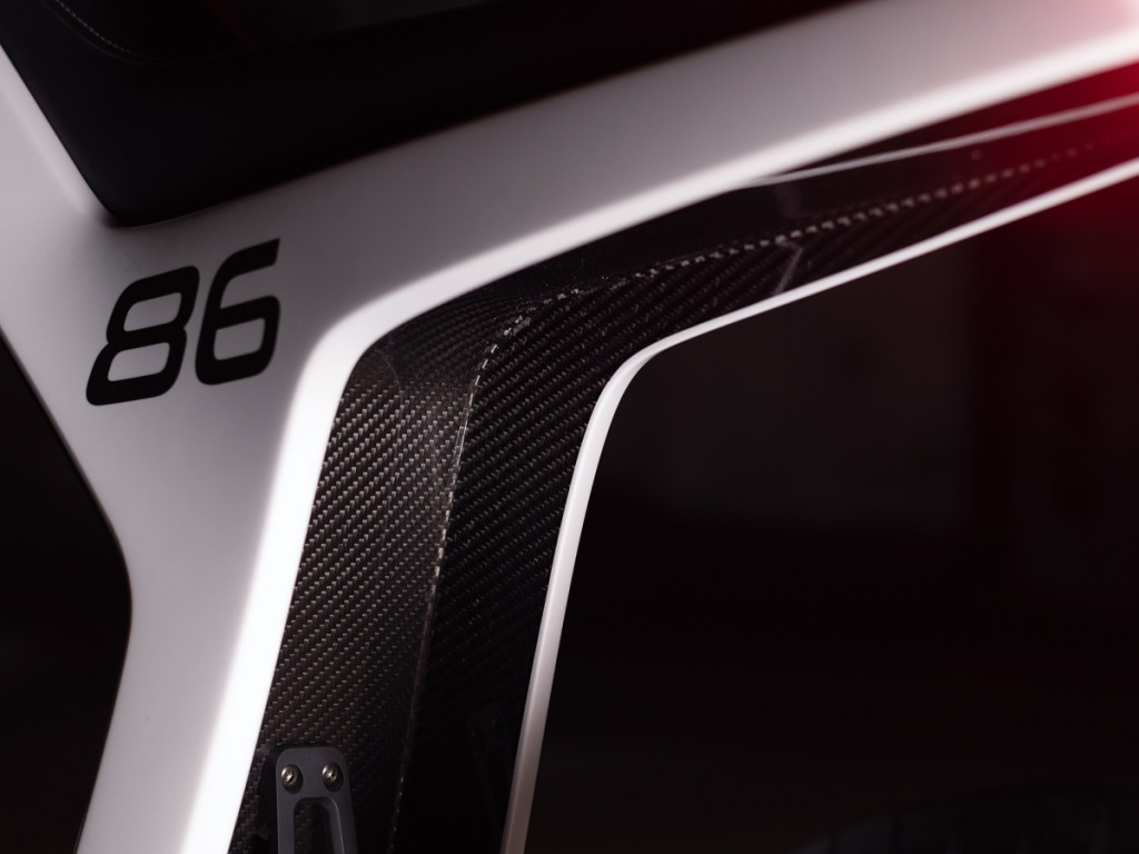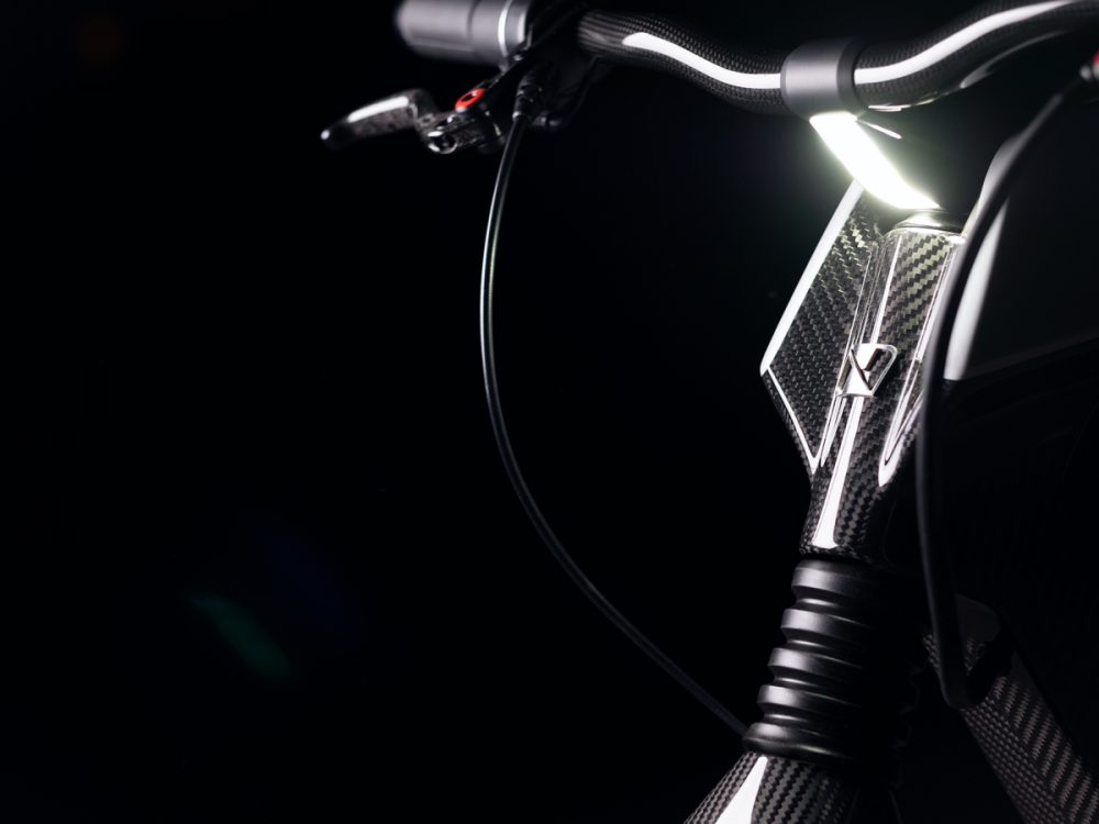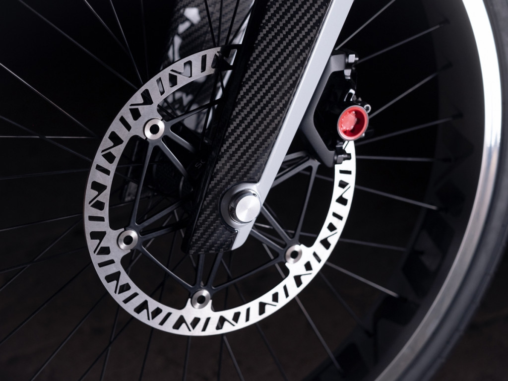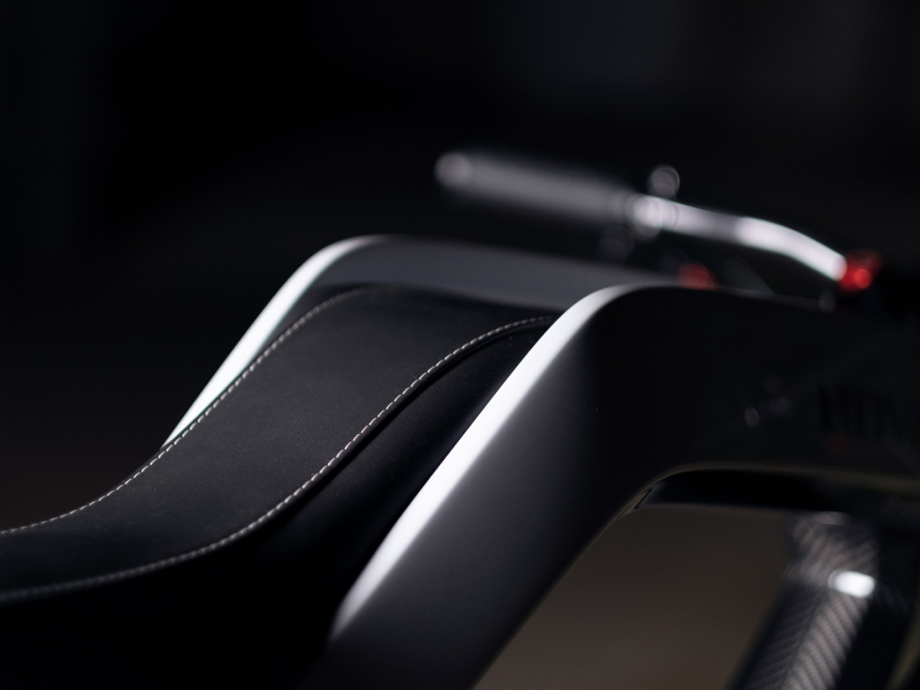 Kelihatan lubang besar di tengah frem yang jelas menyerlahkah ciri ringan motosikal elektrik ini yang cuma seberat 38.5kg. Banyak komponen terselindung di sebalik frem monokok karbon itu sendiri. Sistem suspensi menggunakan absorber jenis monoshock di depan dan belakang dengan fork dan swingarm gentian karbon, manakala unit bateri diletakkan di bawah untuk memberikan lebih kestabilan tunggangan.