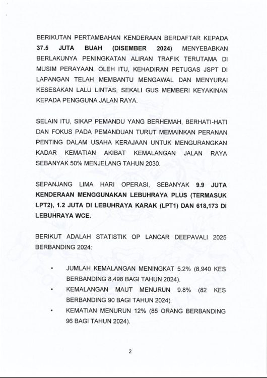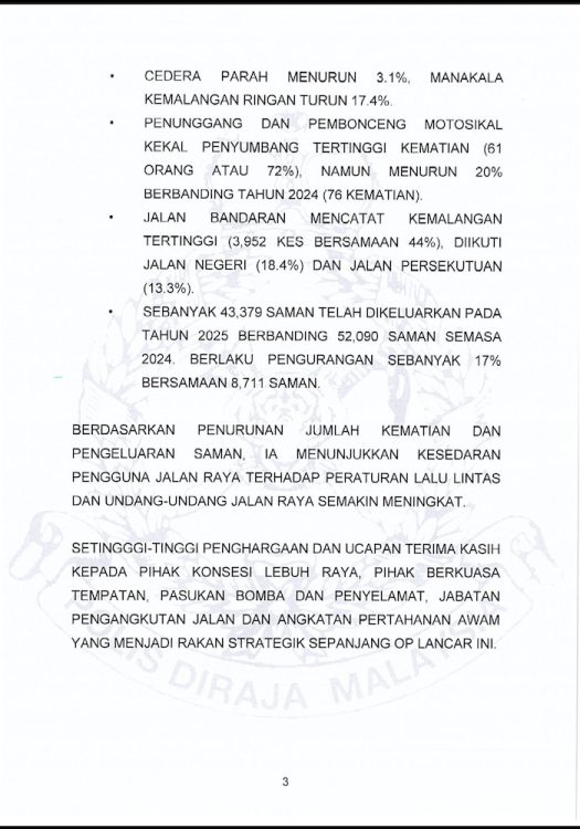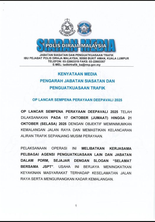 STATISTIK Op Lancar Deepavali 2025 menunjukkan perkembangan positif yang menyaksikan penurunan jumlah kemalangan maut dan saman trafik, menandakan tahap kesedaran pengguna jalan raya semakin meningkat.