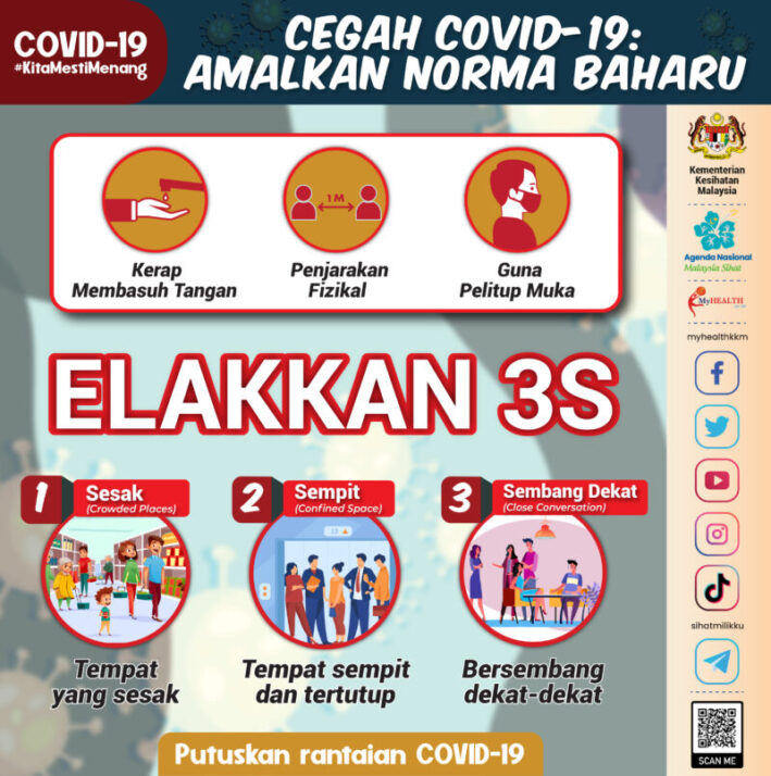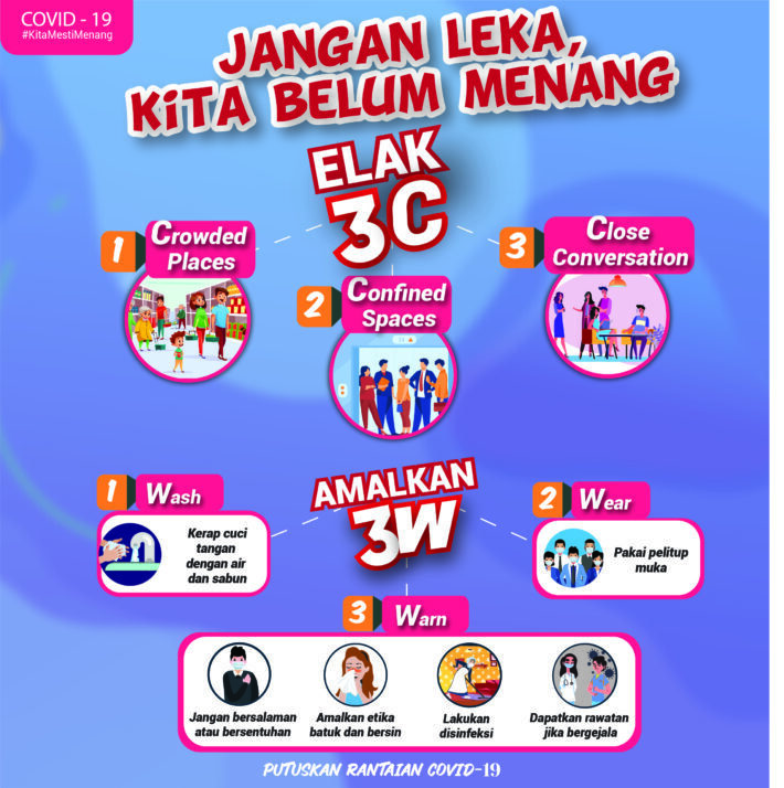 - PATUH Prosedur Operasi Standard (SOP) seperti penjarakan fizikal, memakai pelitup muka dan kerap membasuh tangan atau menggunakan sanitasi tangan.