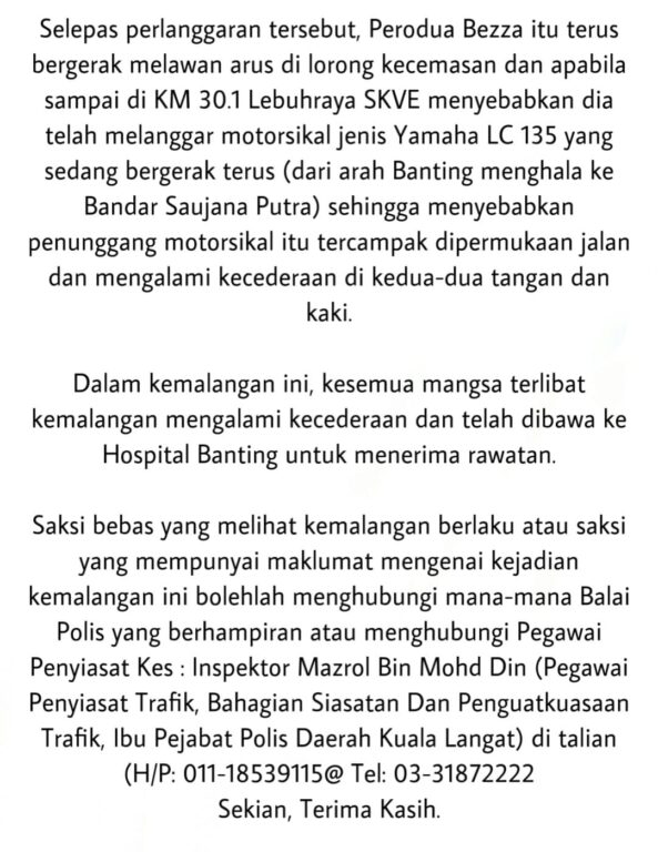 Tidak cukup itu, suspek Bezza terus memandu melawan arus dan melanggar pula penunggang LC 135 hingga menyebabkan mangsa tercampak dan cedera parah. Semua mangsa dihantar ke Hospital Banting untuk rawatan. Berdasarkan maklumat Facebook, abang kepada salah seorang mangsa penunggang motosikal, adiknya kini masih koma dengan tiga organ rosak, manakala kedua-dua kaki patah.