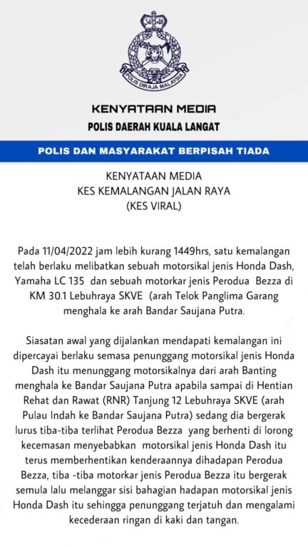 Menurut polis, penunggang Dash mendakwa melihat Bezza dipandu suspek berhenti di lorong kecemasan yang membuatkan dia berhenti di depan kereta itu. Namun, suspek tiba-tiba bergerak semula dan melanggar mangsa hingga menyebabkan penunggang Dash itu terjatuh dan cederakaki dan tangan.