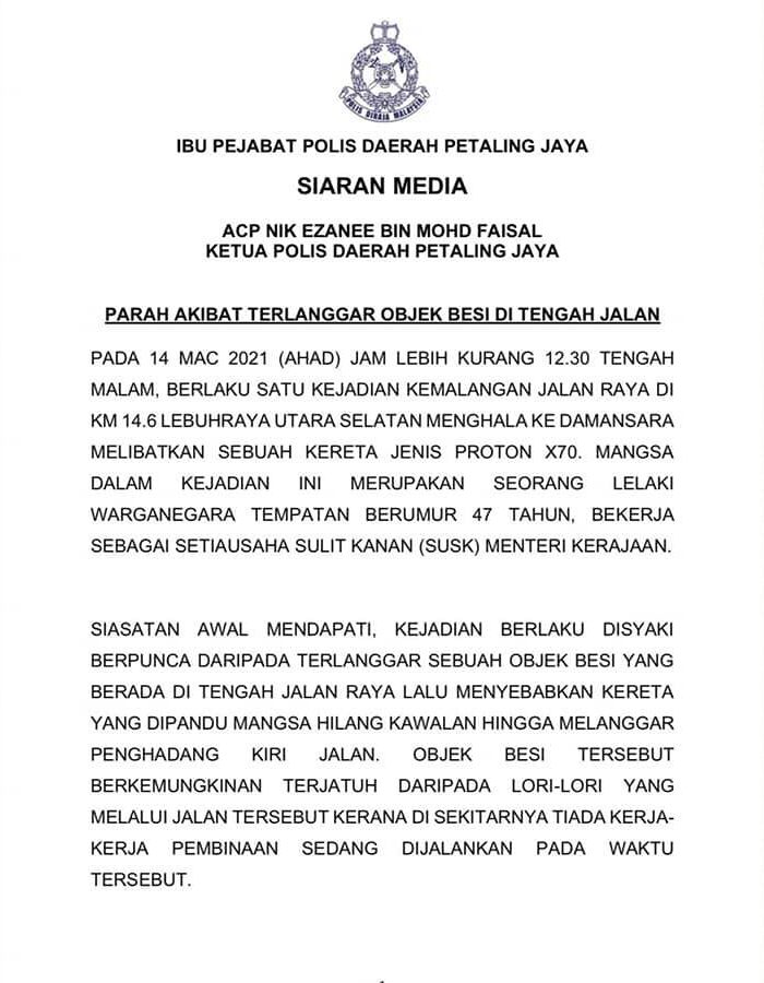 X70 dipandu mangsa mengalami kerosakan pada bahagian cermin depan yang mana objek besi tersebut dipercayai terjatuh dari lori yang melalui jalan sama memandangkan tiada sebarang kerja pembinaan di lokasi berkenaan ketika insiden berlaku.