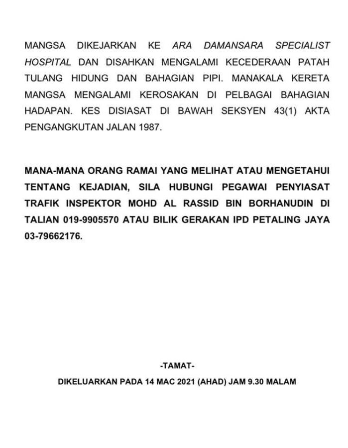 Kejadian berlaku kira-kira jam 12.30 malam di Kilometer 14.6, Lebuhraya Utara Selatan (PLUS) menghala ke Damansara, semalam. Mangsa dibawa ke hospital swasta di Ara Damansara untuk rawatan dan disahkan patah tulang hidung dan pipi.
