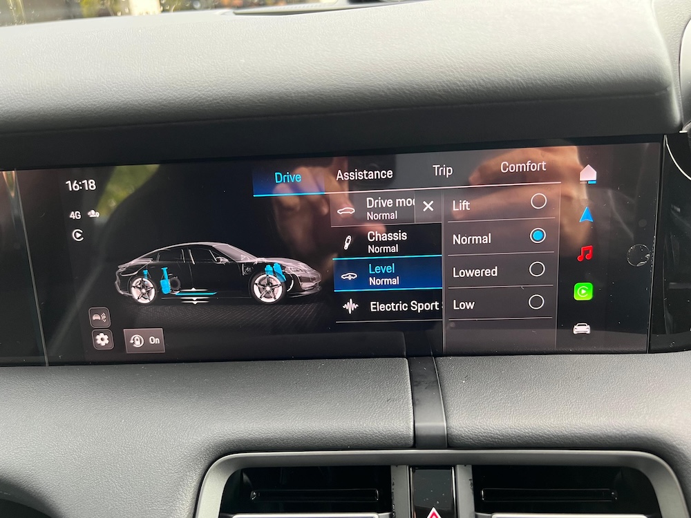 Ketinggian asal Porsche Taycan 4S ialah 1,379mm pada level casis normal. Jadi apabila diubah pada level lift atau low, ia akan mempengaruhi ketinggian asal kereta ini.