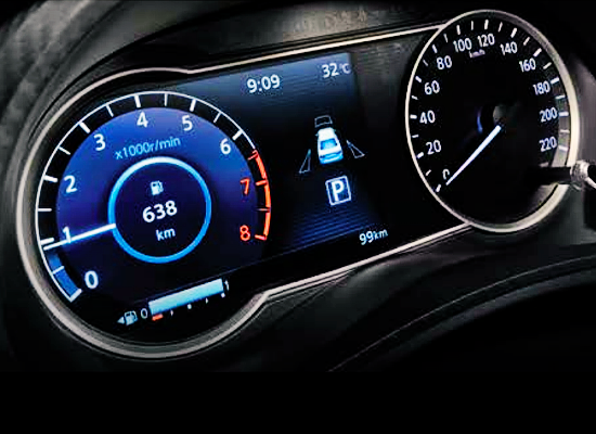 Stereng tiga jejari dengan bawah rata dan kluster instrumen semi-digital warna penuh 7-inci pula menawarkan suasana