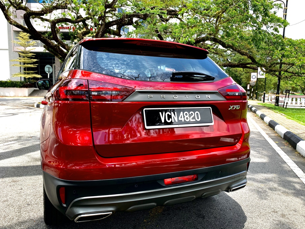 Bahagian belakang menampilkan ciri premium yang menyerlahkan ciri sporty mewah seperti dwi paip ekzos krom yang biasa menjadi gaya asas SUV mewah buatan Eropah dan ditambah pula rim19 inci untuk gaya lebih sasa.