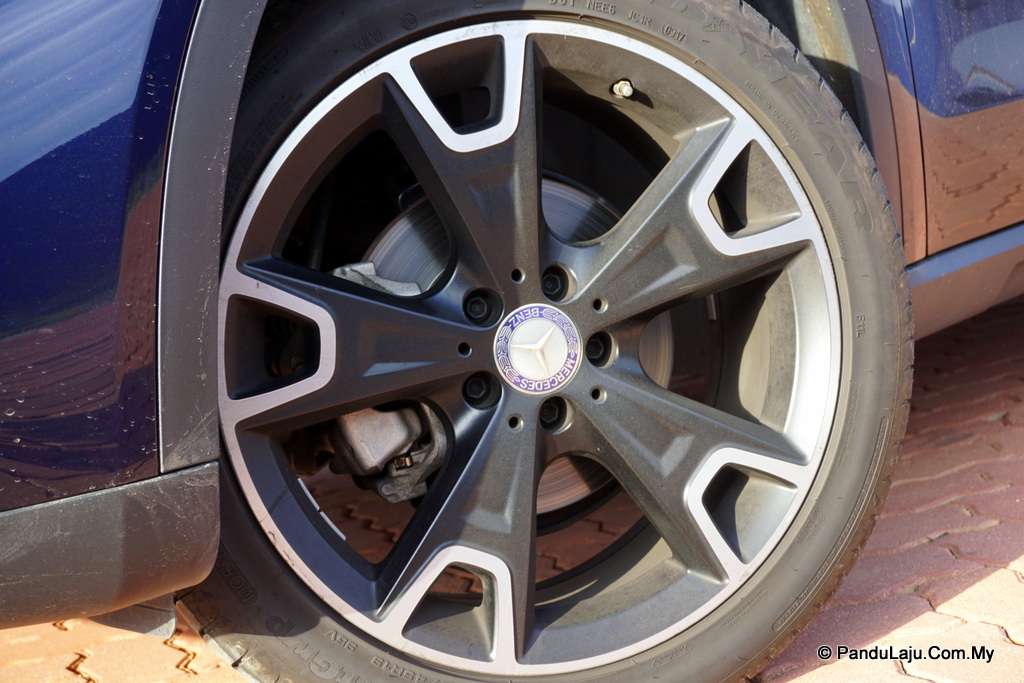 Hadir dengan lampu hadapan LED, Mercedes GLA200 turut dilengkapi spesifikasi Urban Line dengan rim aloi 19-inci warna hitam mayang (matt black) dan kemasan lapisan kilat. Sekali pandang, memang nampak garang.