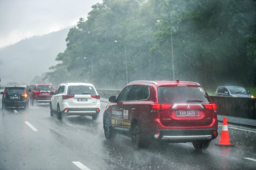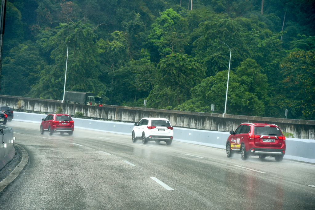 Sepanjang perjalanan ke Janda Baik yang memerlukan Outlander meredah pelbagai laluan berbeza termasuk kawasan kampung dan lebuh raya. Beberapa kali saya cuba sengaja melanggar bonggol dan lubang. Bukan apa, saja nak uji suspensi. Ketika di laluan lebuh raya, malangnya kami tidak dapat menguji ketangkasan Outlander memandangkan keadaan cuaca tidak mengizinkan. Boleh dikatakan sepanjang perjalanan ke Janda Baik ditemani hujan lebat.