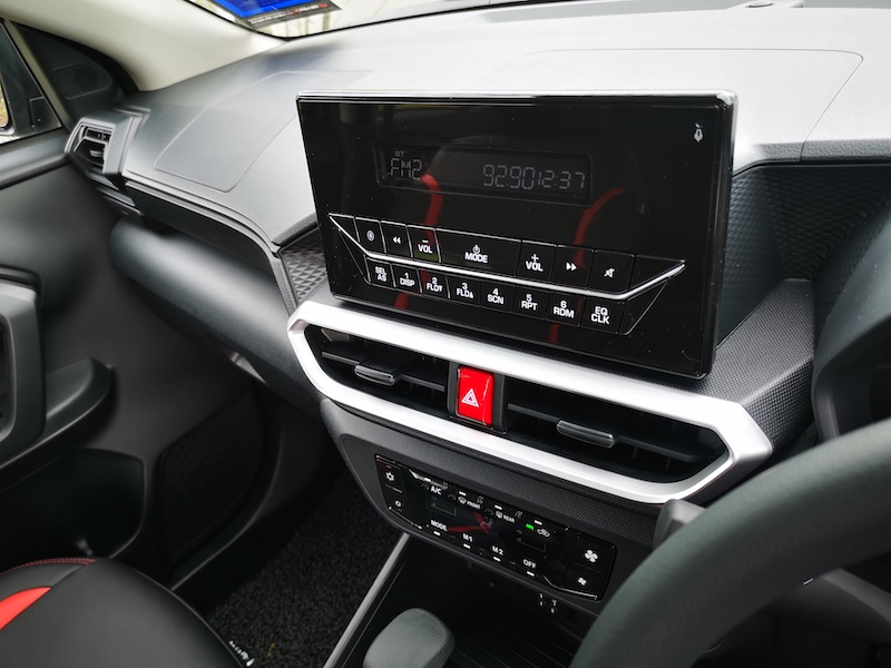 - Ada unit infotainment jenis skrin terapung di tengah papan pemuka, tetapi cuma untuk fungsi radio dan sambungan wayarles Bluetooth. Disediakan juga skrin kecil untuk paparan teks stesen radio dipilih dan jam digital. Sebagai varian asas, bagi saya ini sudah memadai.