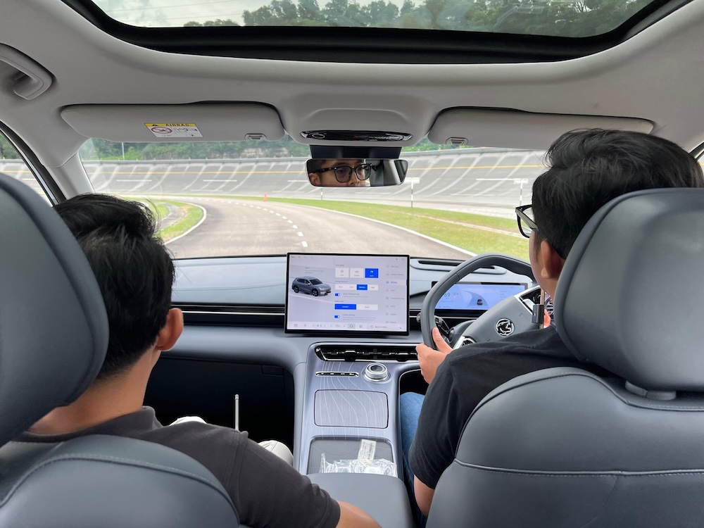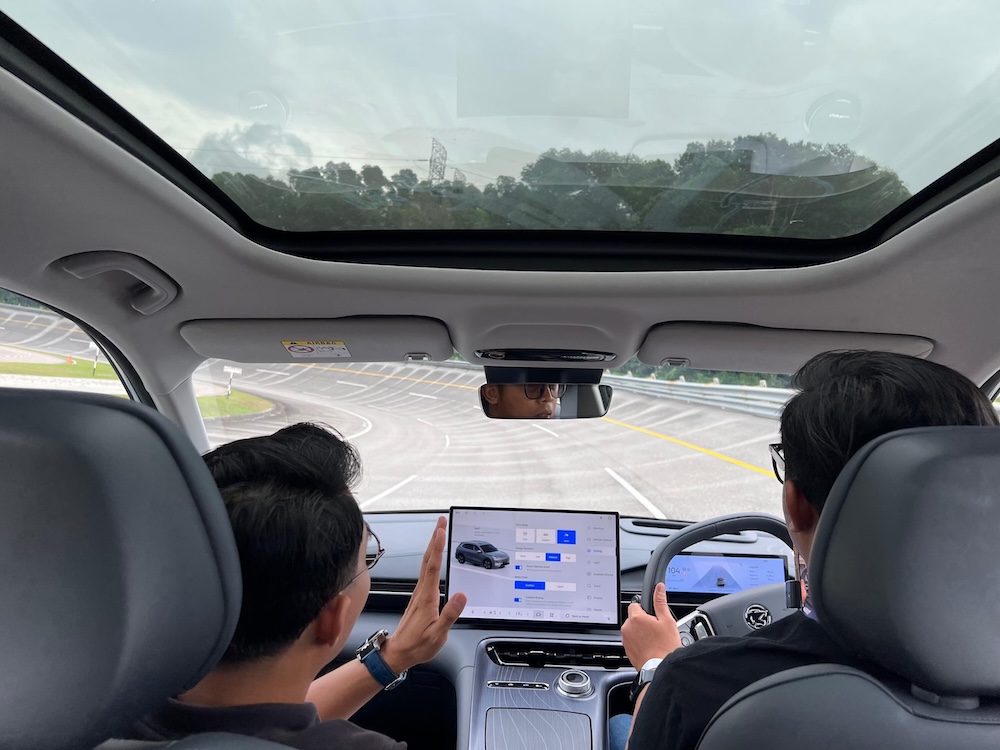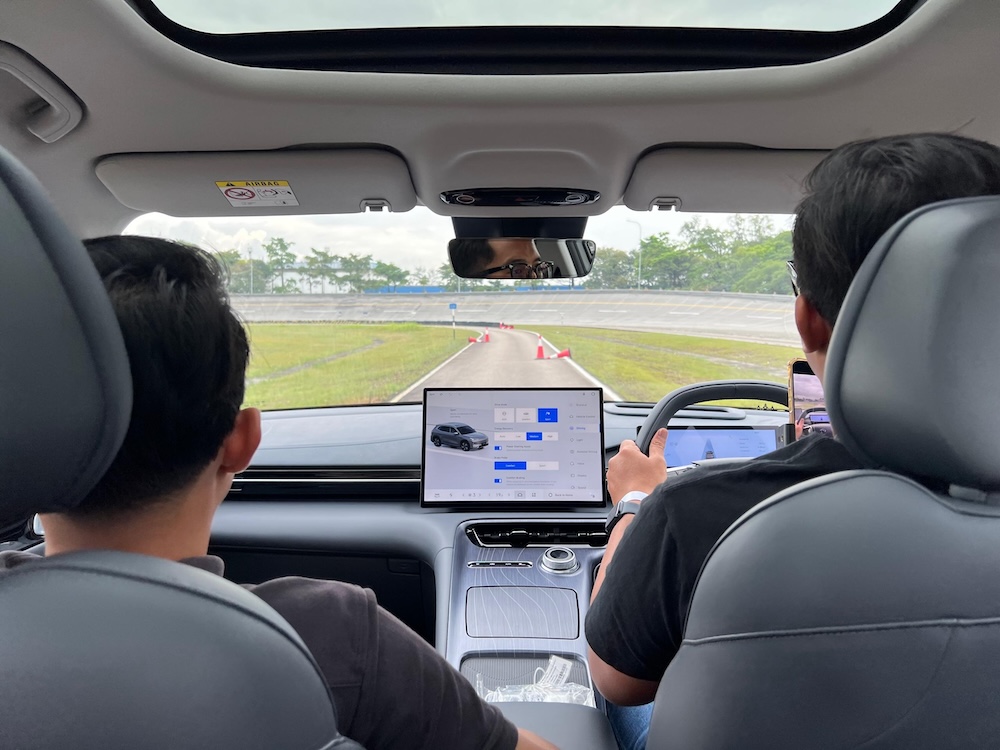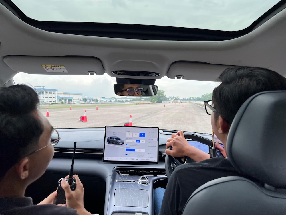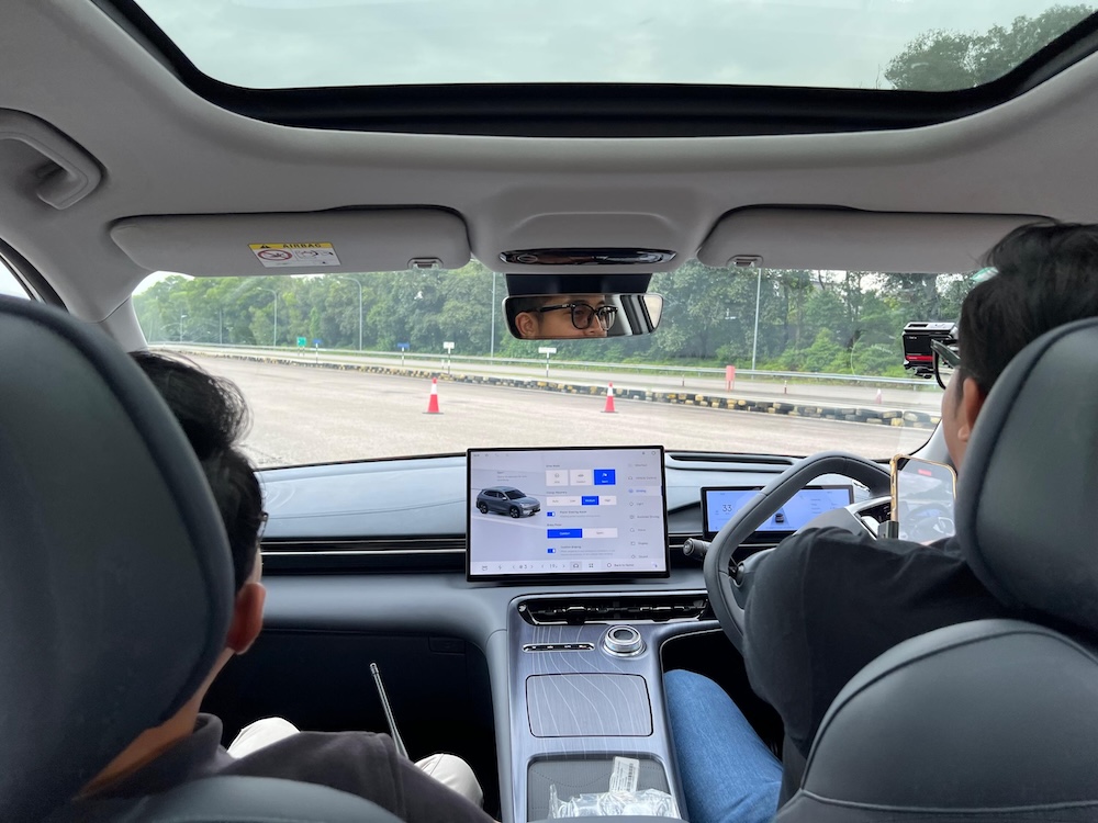 Ketika melalui selekoh itu, saya memandu pada halaju 70-80kmj dengan stereng dipusing jam 10. Sebelum melalui halangan tersebut, bunyi amaran sudahpun aktif dan SUV EV ini pantas diperlahankan, manakala stereng dipusing automatik walaupun masih dipegang tangan.