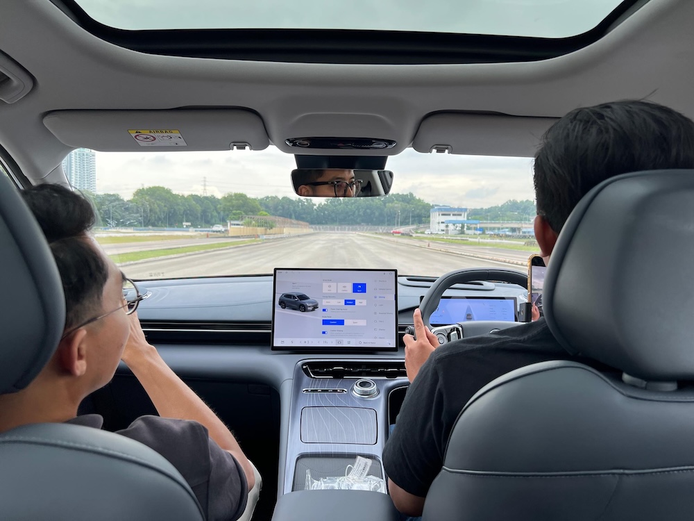 Pusingan pertama saya memandu Proton e.MAS 7 2025 dalam mod pemanduan dan pedal brek Comfort. Pemanduan mod ini rasa stabil walaupun berada pada lorong kedua litar dengan halaju 100-130kmj.