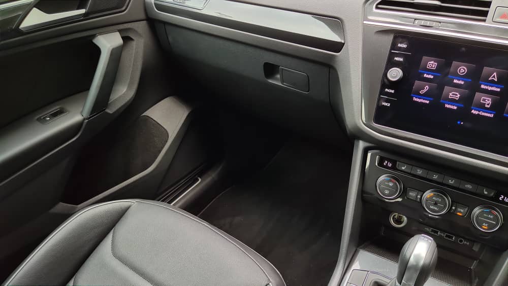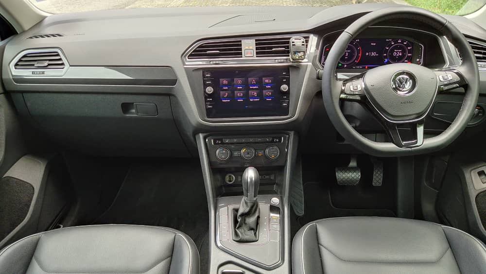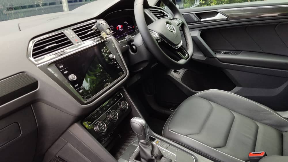 Rekabentuk dalaman kekal sama seperti varian Highline dengan kemasan upholsteri serba hitam daripada material lembut yang nampak mewah dipandang. Semuanya dikompakkan dalam kluster yang diatur rapi. Ambien dalaman Tiguan adalah berkonsepkan sporty, dengan tidak banyak eleman yang mengacau fokus pemandu.