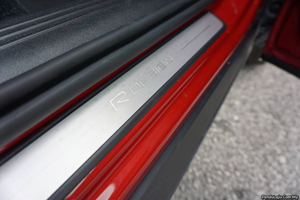 Bampar bawah hitam sedikit tebal menjadikan XC40 nampak lebih tinggi. Secara visual, XC40 sebenarnya nampak lembut, tetapi memiliki cebisan elemen agresif jika diperhatikan lebih dekat. Sentuhan R-Design boleh dilihat pada bahagian pedal kaki, pelapik kepala hitam, dan kemasan aluminium pada pintu, roda stereng dan tuil gear, manakala rim bersaiz 19 inci.