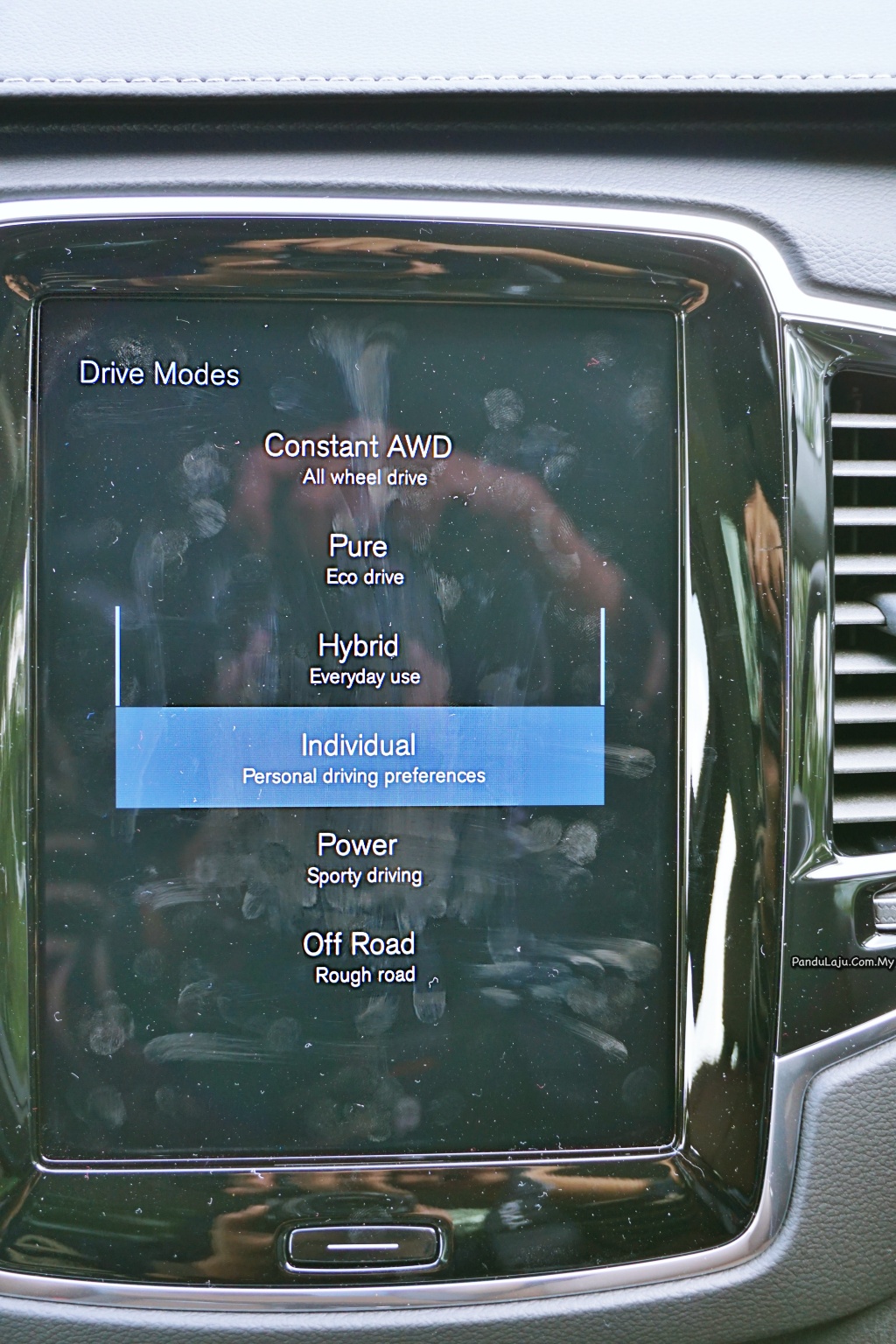 Jadi tidak perlulah ditanya apa yang jadi kalau mod Power diaktifkan. Semestinya prestasi enjin bertukar galak dan responsif. Sebagai makluman, XC90 didatangkan dengan tujuh mod pemanduan: AWD, Save, Pure, Hybrid, Power, Off Road dan Individual. Apabila mod dipilih, sistem komputer kereya akan melaraskan suspensi udara dan prestasi enjin mengikut tetapan yang sudah disetkan.