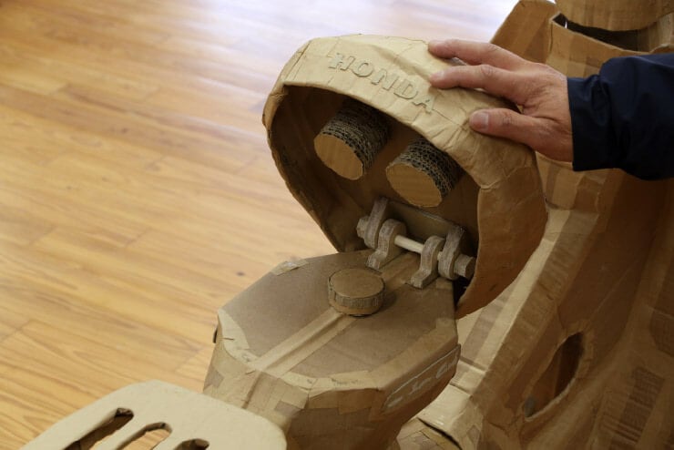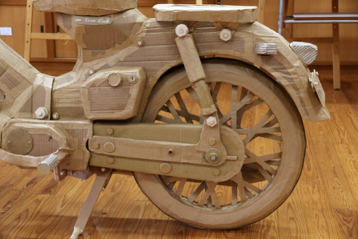 Menariknya, kapcai kadbod itu dibina mengikut saiz sebenar Super Cub C100 dengan perincian hampir sempurna seperti skru, nat, rim, hon hingga replika logo Honda pada pelana.