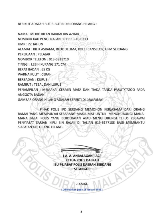 Polis menerima laporan kehilangan Mohd Irfan Hakimi Azhar, 22, yang beralamat di Bilik Asrama, Blok Delima, Kolej Canselor di UPM, Serdang daripada bapa mangsa pada Isnin lalu.