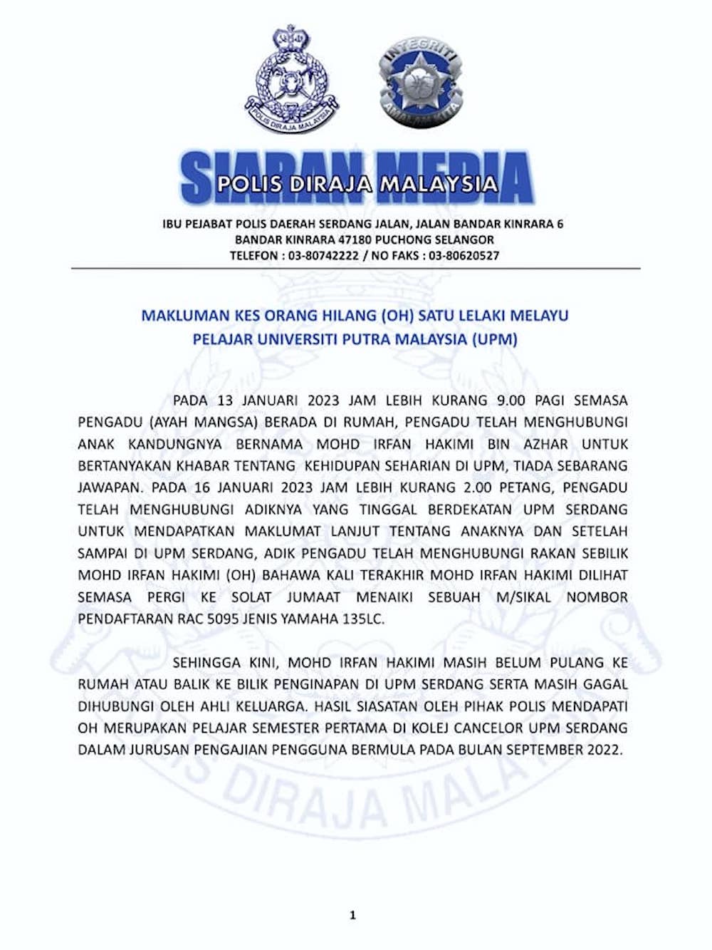 Polis menerima laporan kehilangan Mohd Irfan Hakimi Azhar, 22, yang beralamat di Bilik Asrama, Blok Delima, Kolej Canselor di UPM, Serdang daripada bapa mangsa pada Isnin lalu.