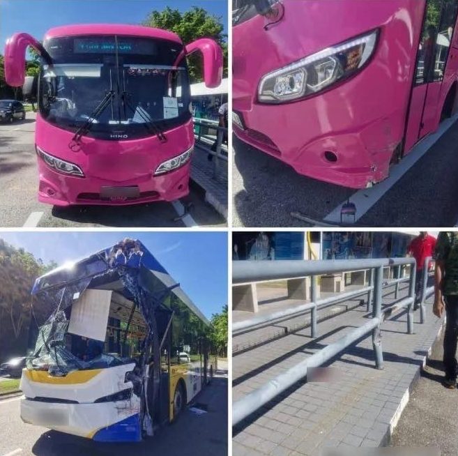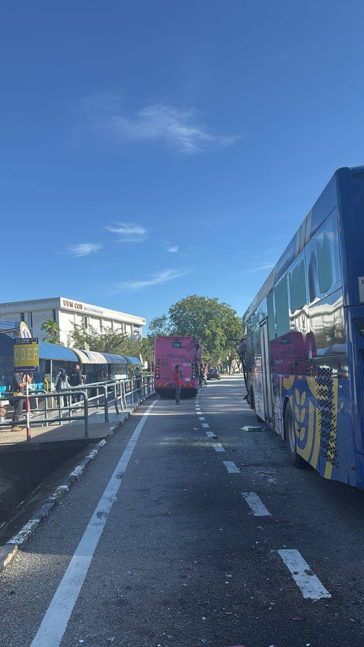 Impak pelanggaran menyebabkan bas pertama menggelongsor ke depan dan melanggar besi pengadang jalan serta menghimpit mangsa yang sedang berjalan kaki menunggu giliran menaiki bas.