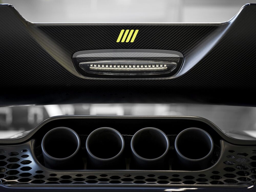 Spoiler aktif diserikan logo MSO dalam kemasan Gloss Blue Tint Visual Carbon Fibre dan aksen Satin Carbon Fibre pada permukaan atas.