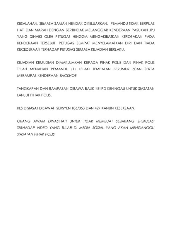 Pemeriksaan dijalankan mendapati terdapat kesalahan. Ketika saman hendak dikeluarkan pemandu tidak berpuas hati dan marah dengan bertindak melanggar kenderaan pasukan JPJ yang dinaiki petugas hingga menyebabkan kerosakan pada kenderaan tersebut. Petugas (JPJ) sempat menyelamatkan diri dan tiada kecederaan terhadap petugas ketika kejadian."