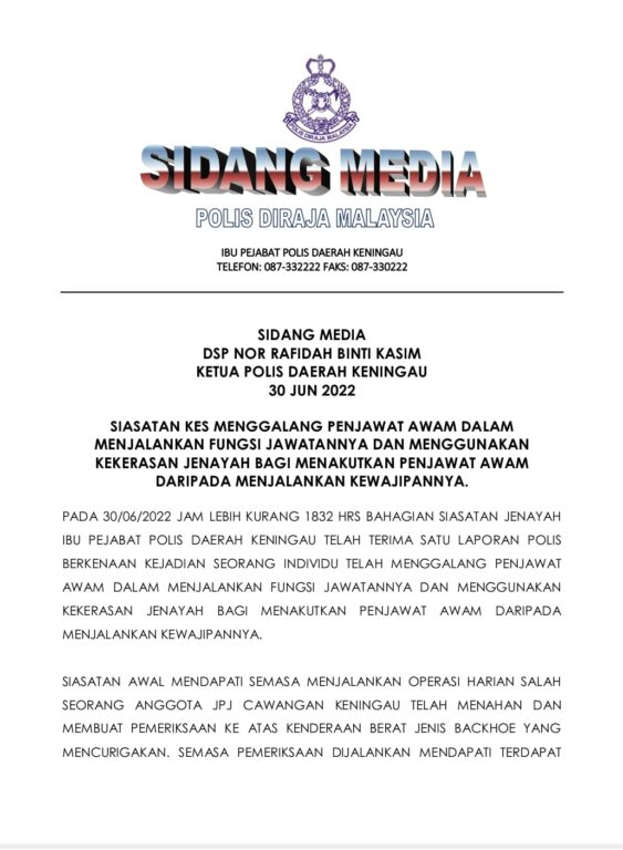 Susulan itu, polis menahan pemandu berkenaan dan merampas backhoe yang dipercayai terlibat dalam kejadian tersebut. Kes kini disiasat di bawah Seksyen 186/353 dan 427 Kanun Keseksaan.