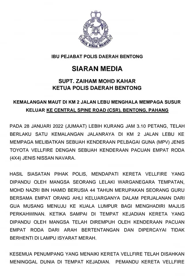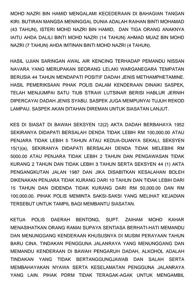 LAGI kes kemalangan maut melibatkan pemandu di bawah pengaruh dadah yang kali ini melibatkan seisi keluarga menaiki kenderaan pelbagai guna (MPV) Toyota Vellfire dan sebuah trak pikap Nissan Navara di KM2 Jalan Lebuh ke Mempaga berhampiran susur ke Lebuhraya Central Spina Road (CSR) di Bentong, Pahang, semalam.