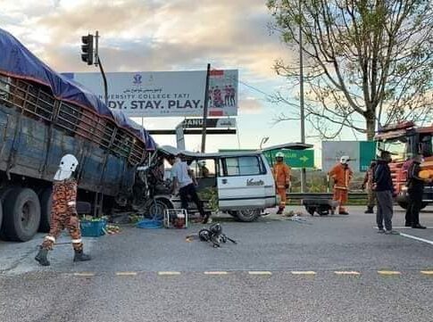 SEORANG pemandu van maut selepas melanggar bahagian belakang yang tertanggal daripada kepala treler ketika sedang membelok di KM28.6, Jalan Dungun-Bukit Besi di persimpangan lampu isyarat ke Plaza Tol Bukit Besi, Dungun, pagi tadi.