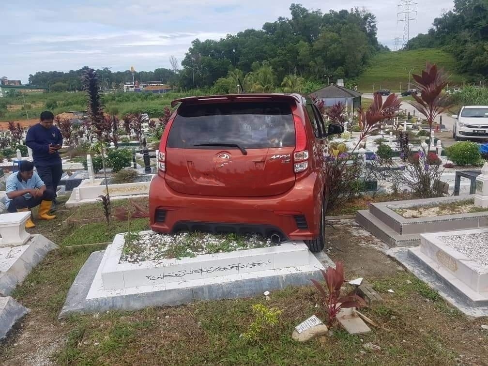 Myvi dipandu pemandu wanita berusia 60-an tahun itu dikatakan terbabas hingga melanggar dan merosakkan empat kubur di Tanah Perkuburan Islam Forest Heights Senawang, Negeri Sembilan.